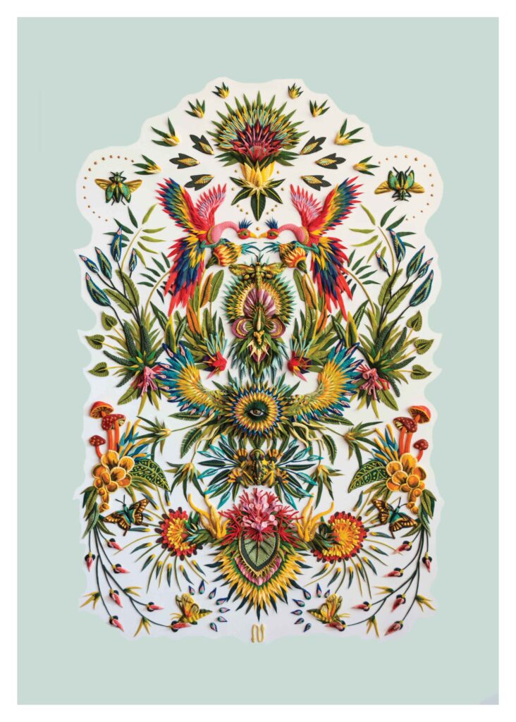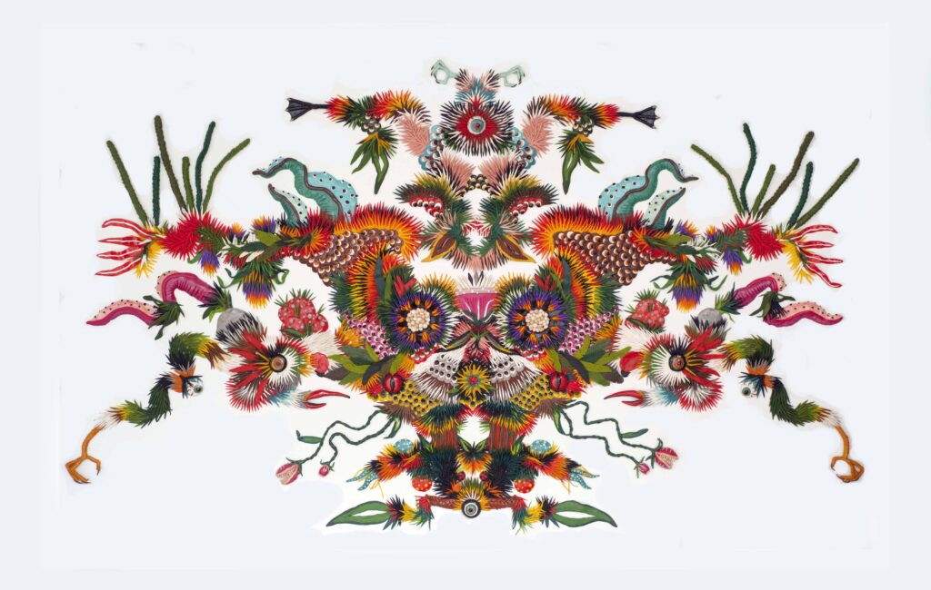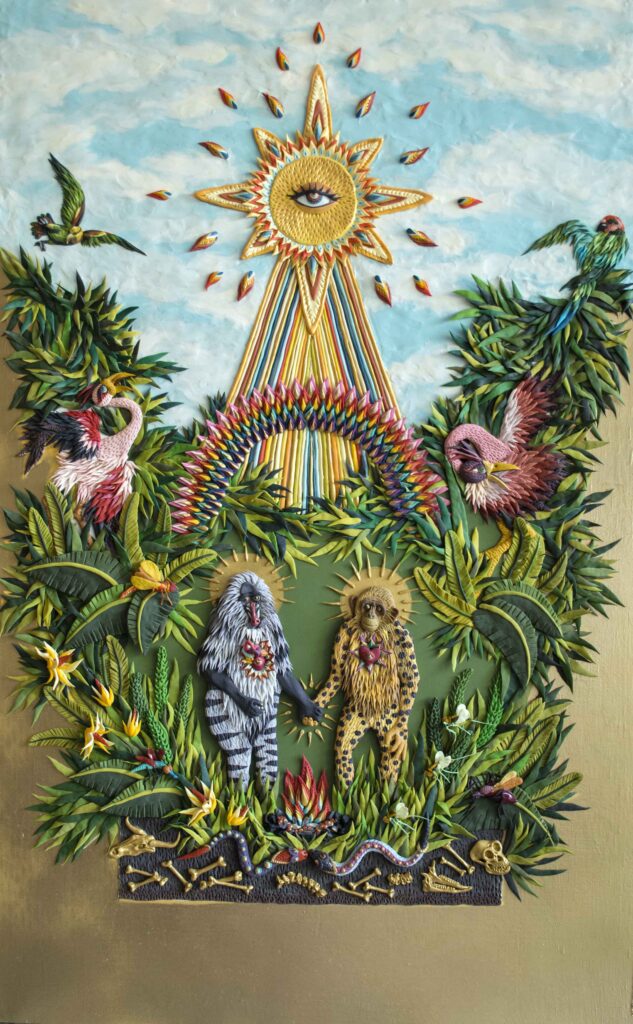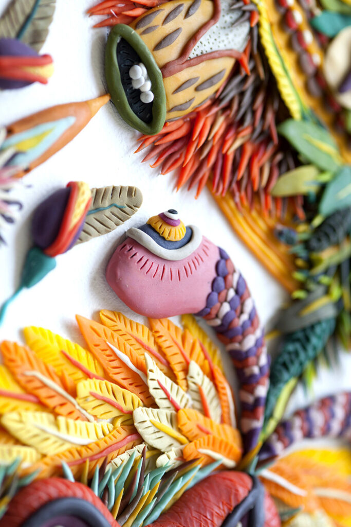 Nora Unda (Santiago, Chile, 1982) is a sculptor and visual artist whose practice transforms an unexpected material—plasticine—into complex, luminous reliefs. Trained at the University of Chile and specialized in bronze and aluminum casting, she brings a sculptor’s sensibility to surfaces: building volume, texture, and narrative through countless hand-placed gestures. Her works unfold as dreamlike compositions—abstract ecosystems, fragmented landscapes, and symbolic beings—rooted in nature, animals, and the visual language of cinema.
